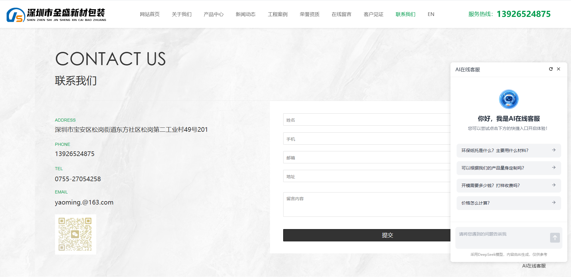 官网:联系我们页面+AI在线客服+底部联系方式
